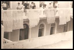 Nuestra casa era como un baluarte, donde divisábamos cualquier acontecimiento desde el Puente Almina hacia el puerto, oteando el horizonte veíamos Gibraltar y las costas andaluzas. Una criada que tuvimos por aquel entonces, decía que le gustaría llegar hasta “la raya que se veía a lo lejos” Era ni más ni menos que el horizonte. Las fiestas del Carmen eran un acontecimiento digno de ver, con los fuegos artificiales. Recuerdo un gran incendio en el muelle de la Puntilla. Grandes petroleros entrando o saliendo del puerto. Cuando mi padre tenía que viajar a la península, desde la terraza les decíamos adiós con un pañuelo, antes de que el barco saliera por la bocana. Disponíamos casi en exclusividad de la larga terraza que daba a la marina y una vez en sobre estas terrazas, estaba la del total del edificio, teniendo vistas a los cuatro puntos cardinales, Hacho, Benzú, Costas andaluzas o costas atlánticas.